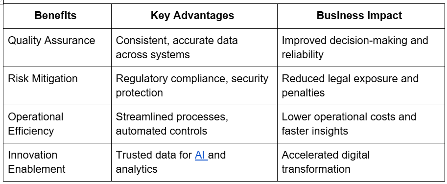 Strategic governance is more than maintaining control. It ensures data actively supports business goals. When information governance aligns with core objectives, it improves data quality, strengthens security, supports compliance, and accelerates decision-making while maintaining the right balance between accessibility and protection.