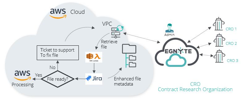 Customers use Egnyte to collect research data from external CROs. AWS can “grab” new files from specified folders through PCC and create a Jira ticket to notify the support team and track the progress of the research. The Jira ticket includes the link to the Egnyte source file, and the source file metadata is appended with a link to the Jira ticket.