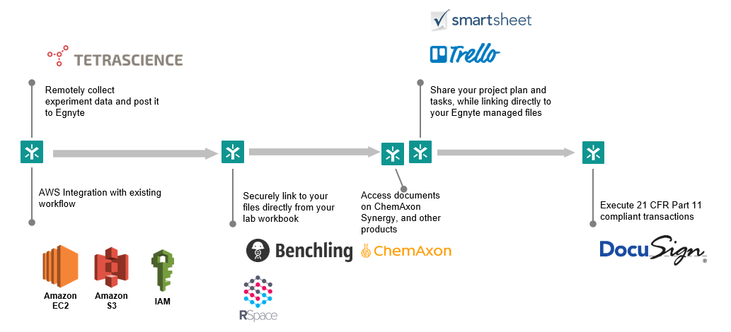 Egnyte integrates with more than 150 industry specific applications, including Tetrascience, ChemAxon, Benchling, Rspace, Science Exchange, Catalytic, Dotmatics, xLM and ViQi. Life sciences companies get a single access point for all of their critical content in the cloud, which makes it easier to exchange data with external partners. Researchers can retrieve and organize trial data and handle large file formats, while reducing bandwidth usage at the same time.