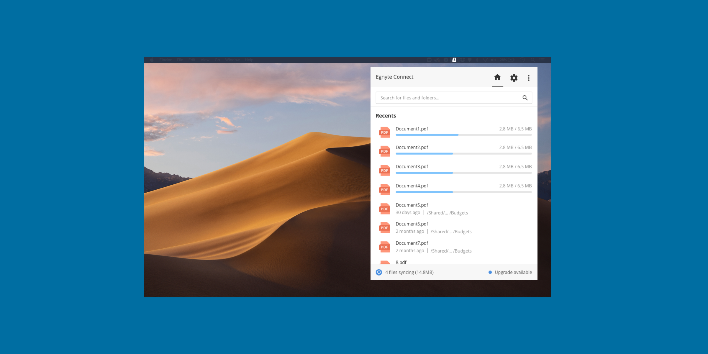 The Egnyte Connect Desktop App 3.6 release for Windows and Mac has improved progress indicators that allow you to better track upload and download status. The release also gives you the option to “go offline” so that Egnyte doesn’t use your bandwidth - use this option when you’re at an airport, hotel, or on an airplane and have limited bandwidth that you want to use for email or web browsing.
