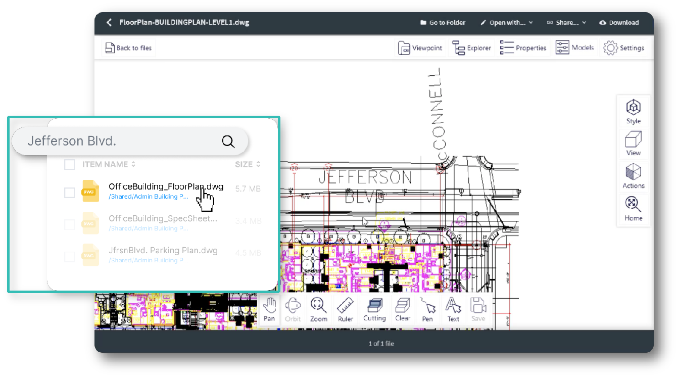 A single project could involve thousands of files, so finding the one with the right information can be a time-consuming process. Now you can search both on file names and within CAD files in Egnyte, making it faster and easier to locate the data you need. And once you find the right file, Egnyte’s BIM File Preview makes it easy to preview its contents.