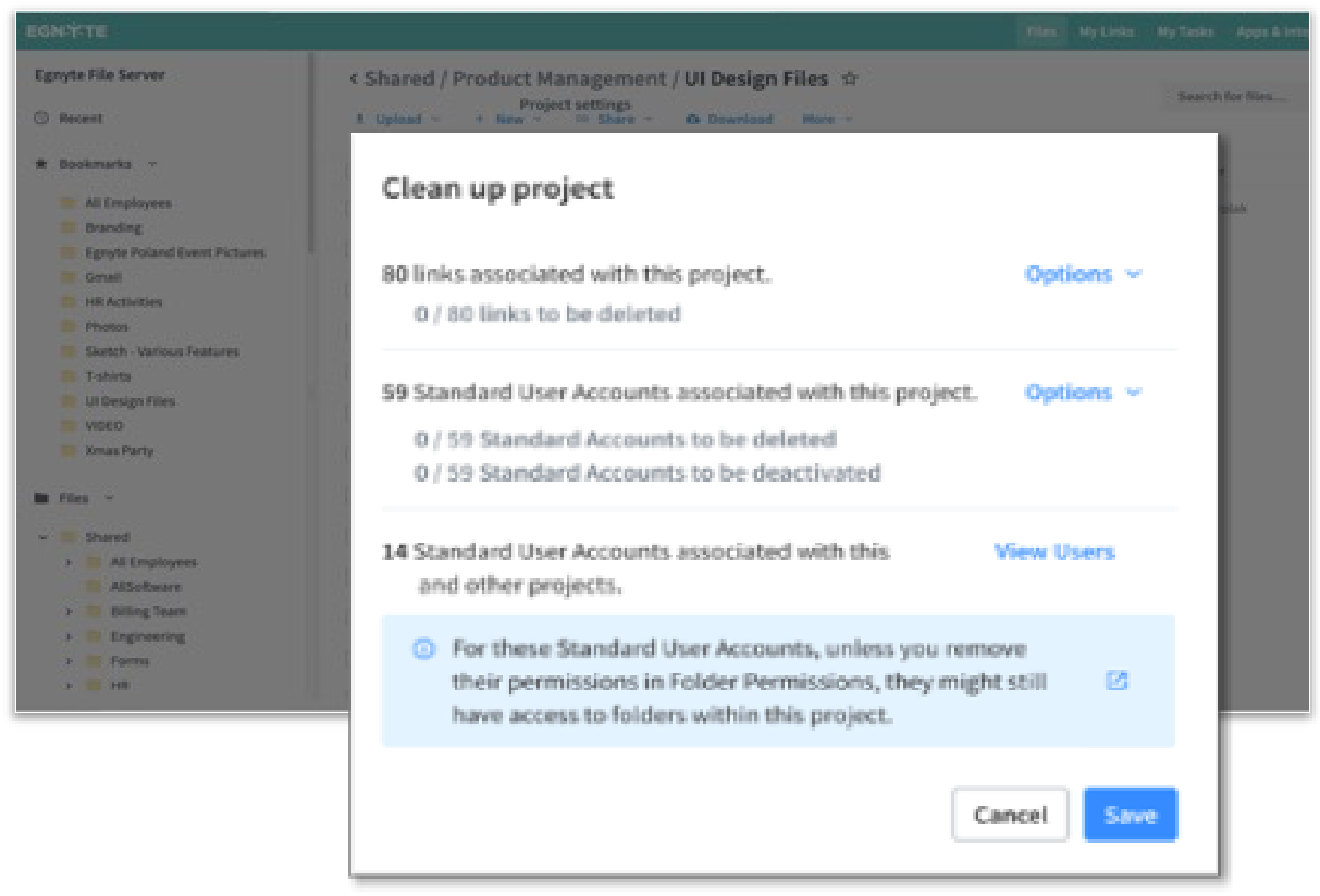Egnyte has also added valuable new lifecycle management capabilities. When a project ends, firms can automatically revoke file access to those who no longer need it, and any critical files are stored securely to ensure you stay in contractual and warranty compliance.