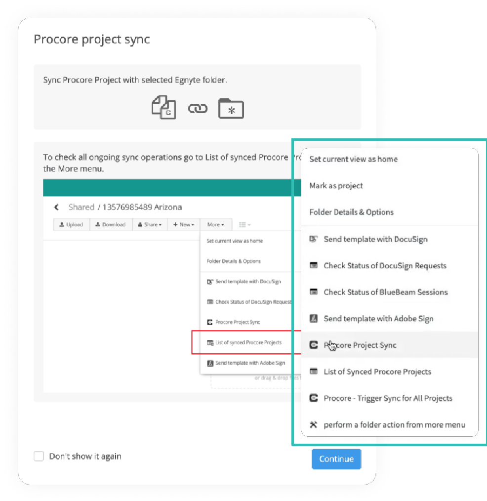 With an enhanced Procore integration, Egnyte serves as the central document repository so everyone can access the latest version of the file, regardless of whether they have Procore access or not. Egnyte’s new advanced integration expands Egnyte’s support for Procore to include up to 1,000 projects, with 250,000 objects per project. The integration also provides real-time file syncs, ensuring the files in Procore and Egnyte remain in alignment.