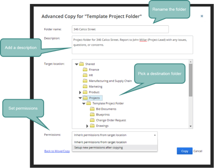 Kick off new projects faster with Folder Templates (Advanced Folder Copy)When you start a new project or sign on a new client, do you find your team recreating the same folder structures over and over again? We’re streamlining this for you.Now in a single step, the “Advanced Folder Copy” feature lets you copy an entire folder hierarchy to another location, rename the copied folder, add a description, and even reset the folder's permissions. Now, users will always have the same folder structure when starting each new project or client program without the hassle.This is great for industries like Construction, Advertising/Media, and other businesses with time-based projects that require similar and consistent folder structures for each new project. Learn more.