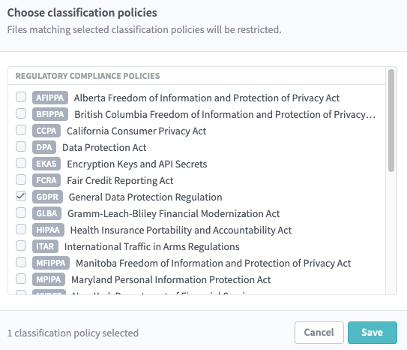 Also, during your initial setup, you should consider adding privacy policies from other jurisdictions that pertain to your business. Egnyte supports various additional privacy regulations from the UK, as well as those from several U.S. states and Canada. It’s useful to scan for these policies in case a citizen from the UK, Canada, or the U.S. is living in the EU.