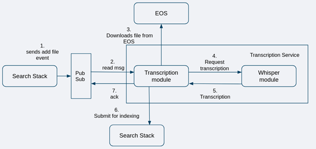 - Transcription Service: A dedicated service that listens to Pub/Sub, downloads the file from EOS, processes it, and then sends the transcription back to the search. It has two modules: