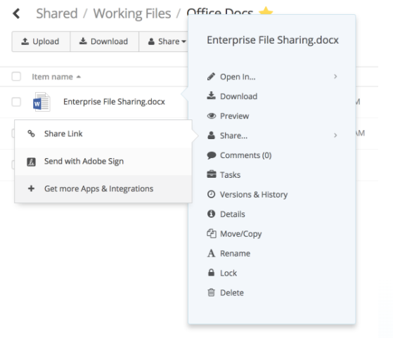Once the review cycle is complete, the project leader can send a request for signatures through one of several Egnyte e-signature app integrations, including Adobe Sign.