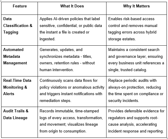 AI-Driven Data Classification: Automatically identifies and tags sensitive content using metadata and machine learning.