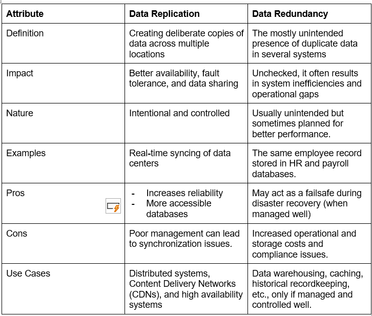 Although they seem similar, data replication is distinctly different from data redundancy.