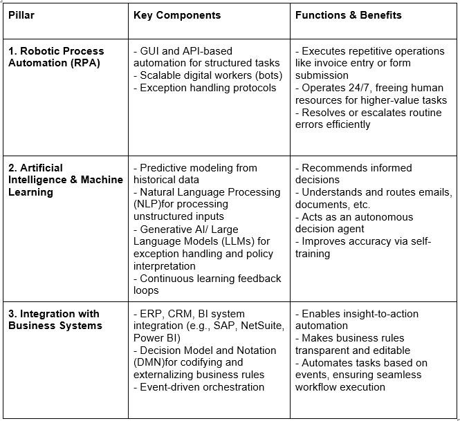 Intelligent workflows blend AI, Robotic Process Automation (RPA), and system integration to unlock automated, secure, insight-driven operations. Here’s how they function: