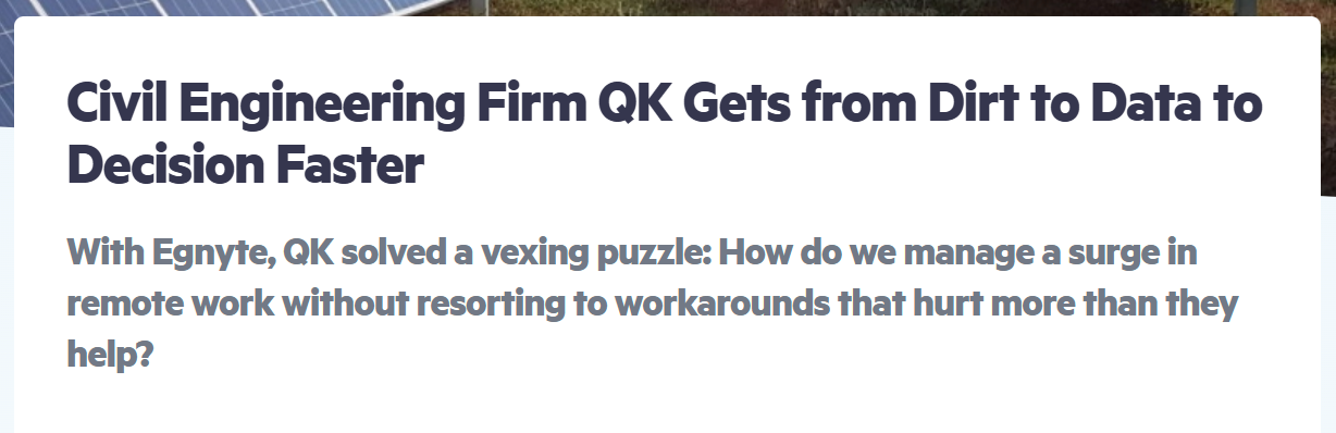 QK collaborated with Egnyte as a central content platform, replacing manual and ad-hoc file-sharing systems. With Egnyte, the firm gained structured access to project files, real-time syncing across field and office teams, and better version tracking. This digital transformation helped QK consolidate project information into a single system of record, making it easier to extract insights and support planning decisions.