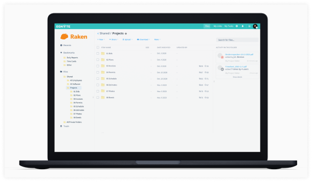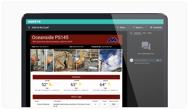 Egnyte and Raken simplify jobsite data capture and daily reporting. With seamless integration and automatic Egnyte storage, you can easily collect jobsite information and generate daily reports—complete with time- and date-stamped photos. This ensures that all project documents and reports are readily accessible for future reference. Egnyte also helps you streamline compliance by enforcing data retention policies on daily reports and project documents, applying legal holds in minutes, and quickly locating the most relevant files.