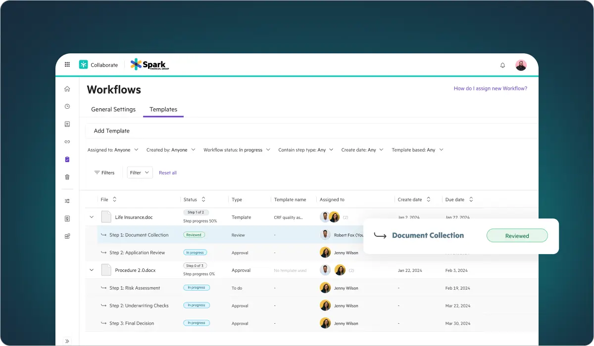 • Simplified document collection with pre-configured templates, on-demand requests, and automated reminders.