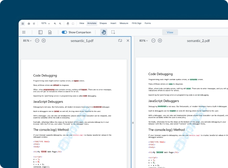Easily identify changes in drawings and documents with intuitive overlays, side-by-side comparisons, and semantic text differences in highlighted word pairs.